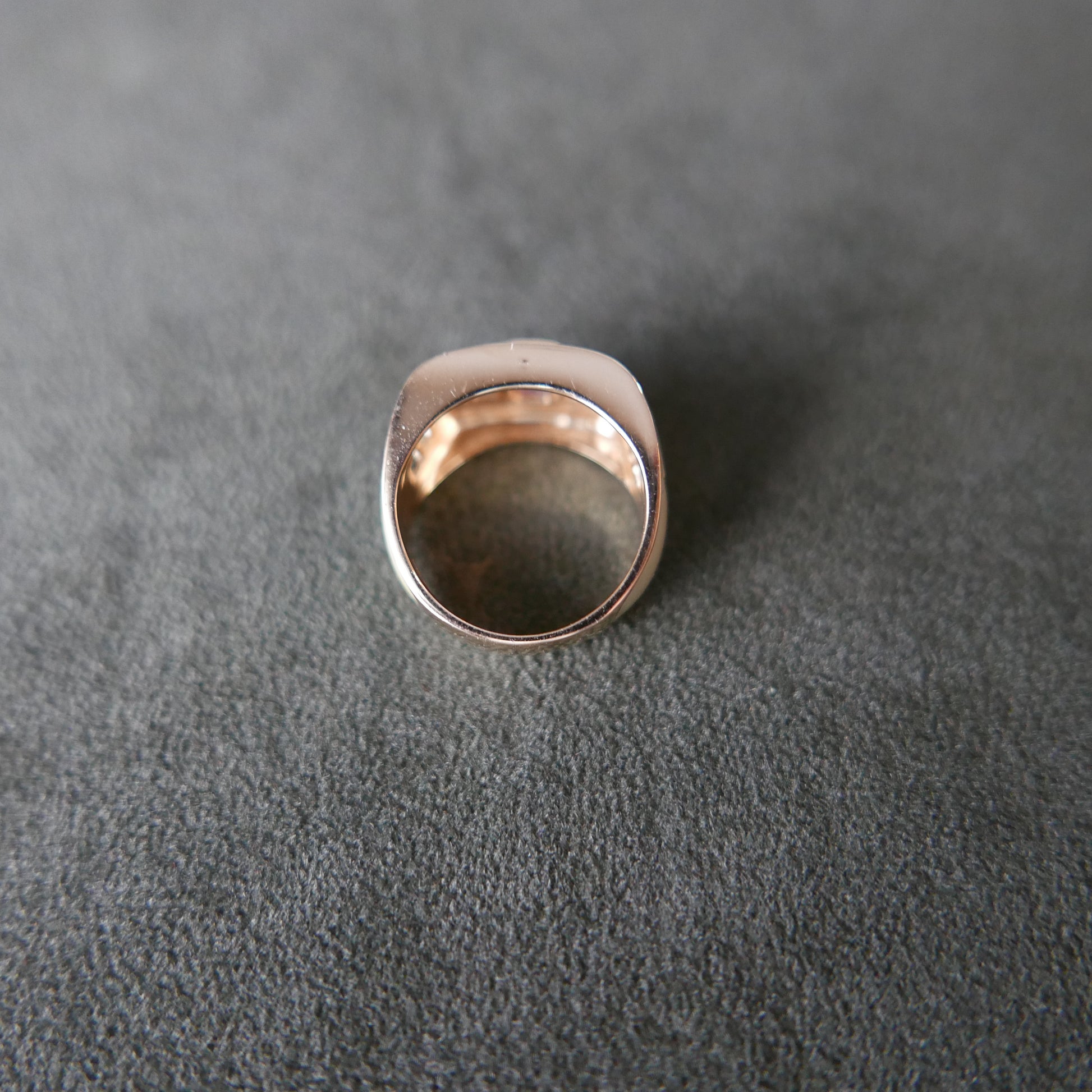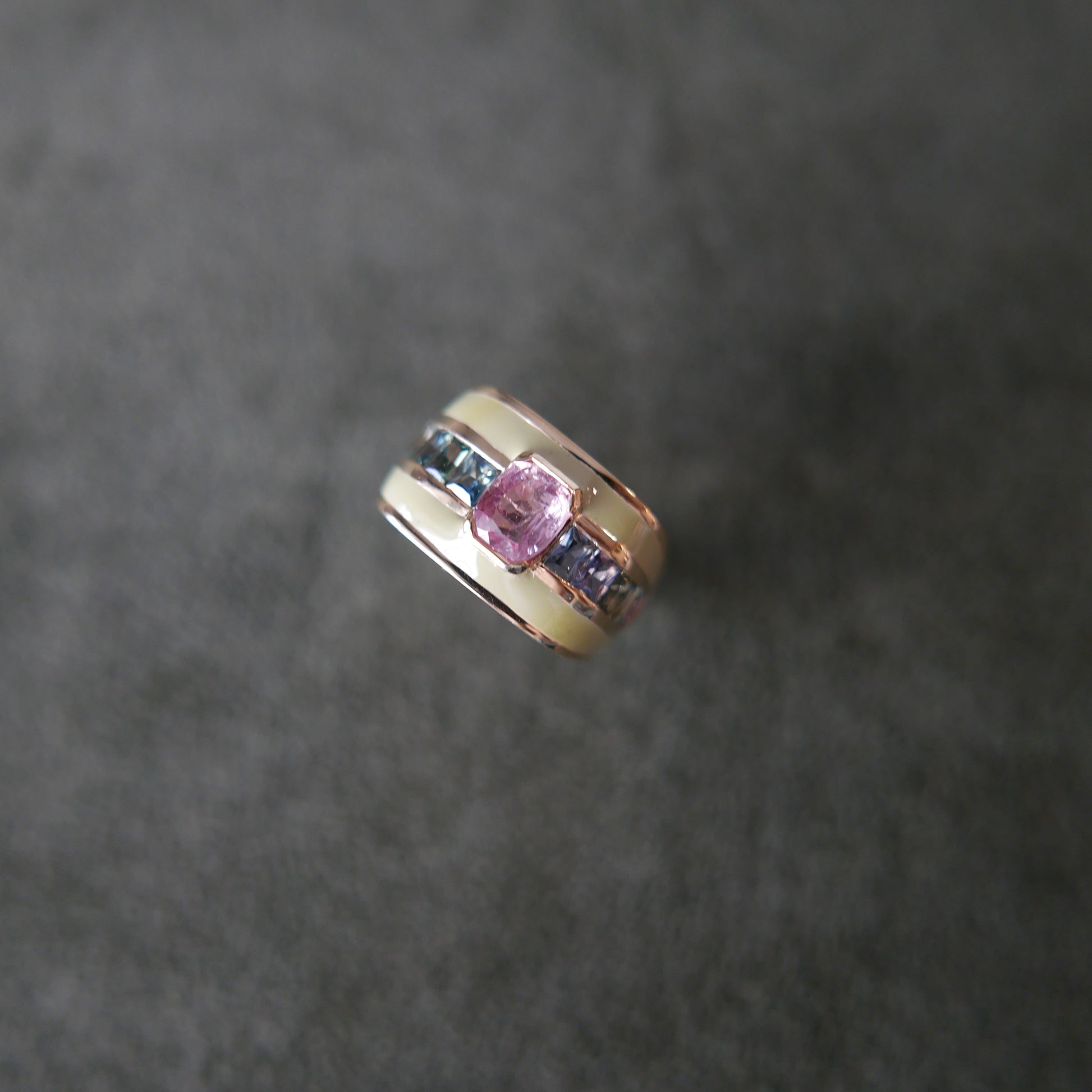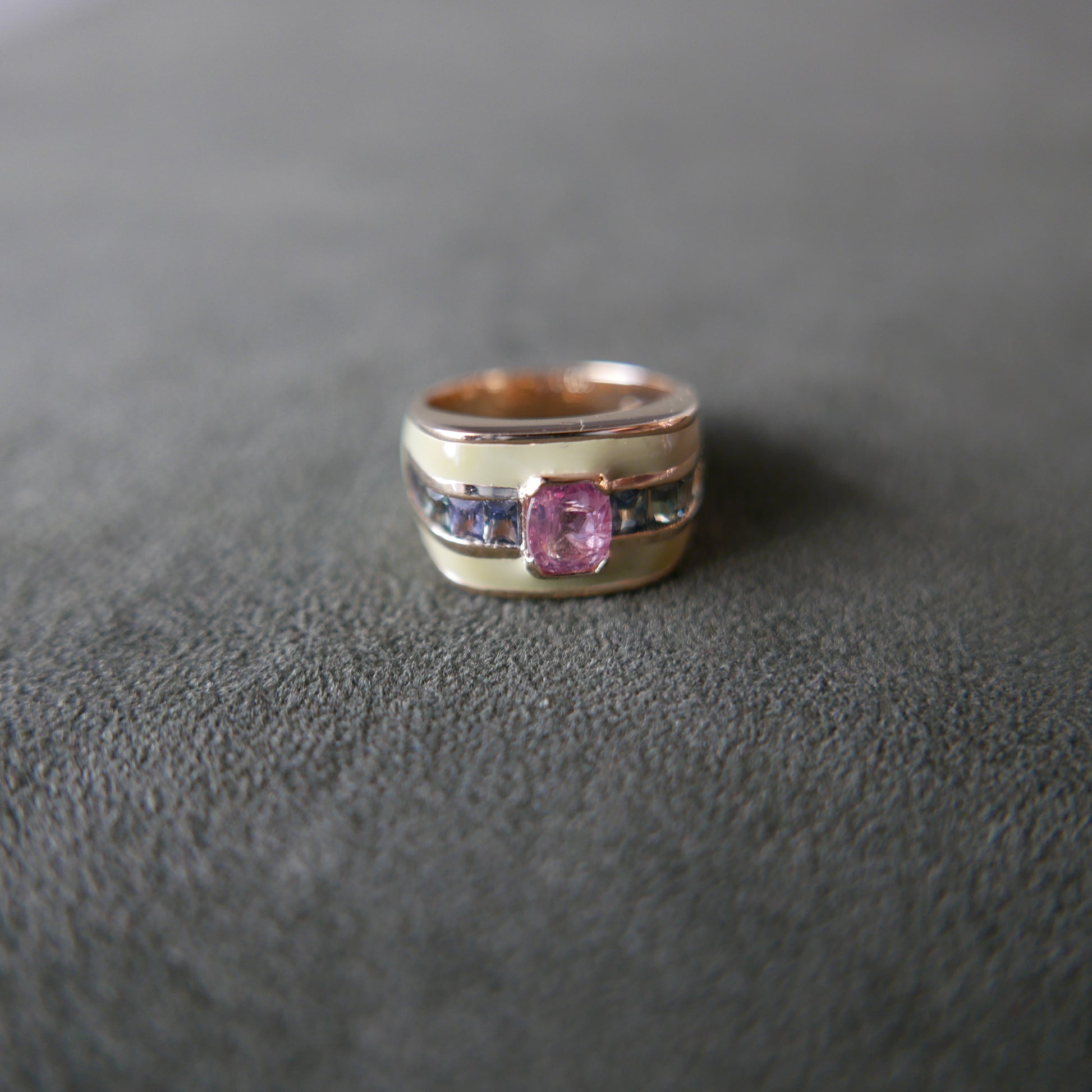 Spinel center with sapphires in invisible cut setting + mint enamel